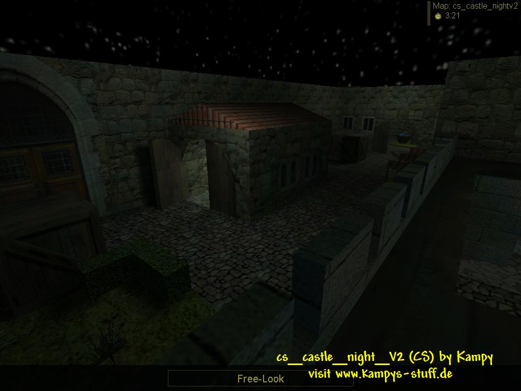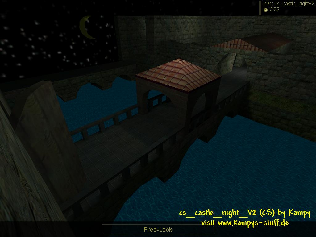 main points of the map: - a castle at night, italy and cbble textures - two sides of a river outside a castle, nice atmosphere - 2-6 players recommended - good opportunities of giving covering fire, balanced gameplay - 3 hostages of which 2 are together hints: - climb the bed in the collapsed chamber to get in the floor above, shoot the doors to get through them - to increase the possibility of rescuing all the hostages, rescue the single standing one at the beginning - the hostage rescue zone is in the collapsed chamber and in the CT base - access the roof on the building (CT-base) or the walls through crates (there are small invisable stairs) or through some plants near the well (CT-base) which is a func_ladder or through climbing the broken part of the wall - you can jump from the wall in the CT base into a window of the passable part of the castle, but dont fall down! (There is an invisable block at the window which makes it easier to jump into it) - dont shoot the moon! :D Changes between the new and the old version of castle_night: - the r_speeds are better in version 2 - the fountain had some grafic errors at the water which are gone now - there are wooden shutters at the windows now (you can destroy them) - a bug appeared with 2 of the hostages being stuck in the ceilling after cs version 1.4 came out - it's gone | |