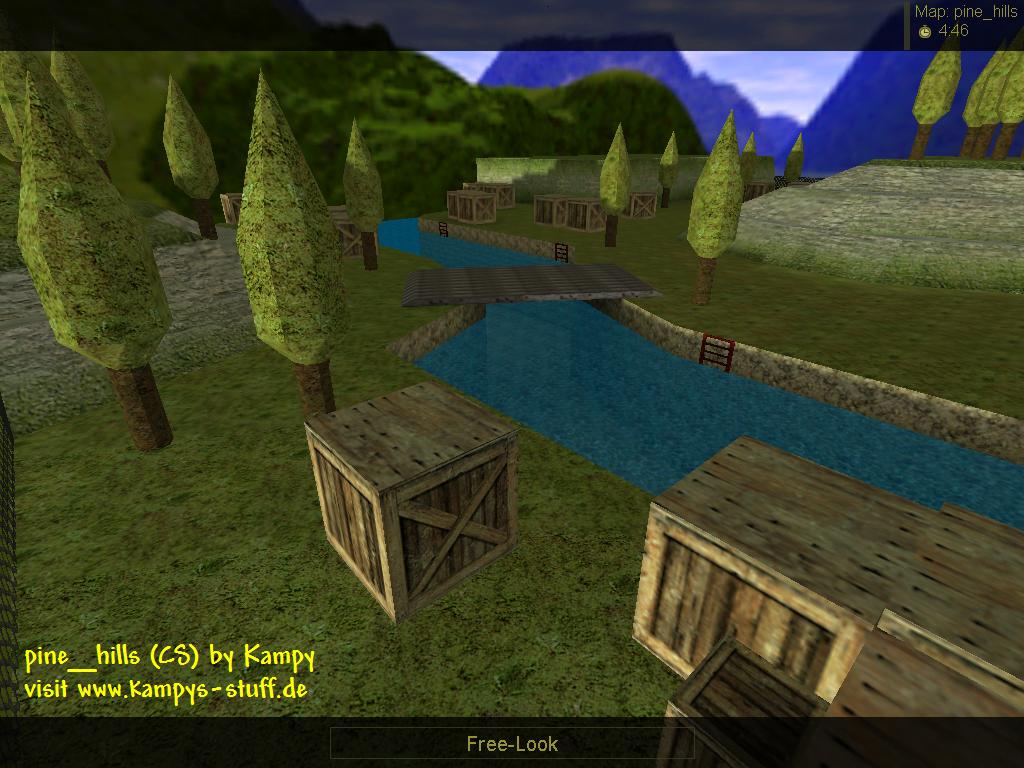 I made Pine_Hills for a modelmaker who made me the Deuce model (File Section) in return. He gave me a lot of room for my own style, he only said: there has to be a river, a bridge and some hills that are passable. So this is actually the map describtion already: there are some hills which where really hard work when I made them and a lot of trees which actually dont look like pines (but I liked the name) and some crates. There is no CS goal in this map - you have to kill the enemy. The map is good for sniping, but is not as most of these fun maps restricted to it. The usual gameplay of this map is that the terrorists camp and the CT storm the front coz they have got more cover. The terrorist can also storm before the CTs can see them which is also a good strategy. The battle is mostly faught at the river - there are several crates to take cover on both sides - or its a sniper duel, then it can be anywhere on the whole map. The gameplay is balanced due to many beta tests. This is a pretty small fun map with a nice atmosphere and a fair gameplay. The R_Speeds are a little too high though, I can only recommend this to owners of good computers. 6 Players is the absolute maximum of players this map can handle by the way - more would be a total mess. | |||||||||||||||||||||||||||||||||||||||||||||||||||||||||||||||||||||||||||||||||||||||||||||||||||||