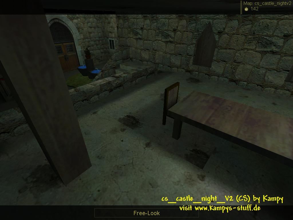 main points of the map: - a castle at night, italy and cbble textures - two sides of a river outside a castle, nice atmosphere - 2-6 players recommended - good opportunities of giving covering fire, balanced gameplay - 3 hostages of which 2 are together hints: - climb the bed in the collapsed chamber to get in the floor above, shoot the doors to get through them - to increase the possibility of rescuing all the hostages, rescue the single standing one at the beginning - the hostage rescue zone is in the collapsed chamber and in the CT base - access the roof on the building (CT-base) or the walls through crates (there are small invisable stairs) or through some plants near the well (CT-base) which is a func_ladder or through climbing the broken part of the wall - you can jump from the wall in the CT base into a window of the passable part of the castle, but dont fall down! (There is an invisable block at the window which makes it easier to jump into it) - dont shoot the moon! :D Changes between the new and the old version of castle_night: - the r_speeds are better in version 2 - the fountain had some grafic errors at the water which are gone now - there are wooden shutters at the windows now (you can destroy them) - a bug appeared with 2 of the hostages being stuck in the ceilling after cs version 1.4 came out - it's gone | |