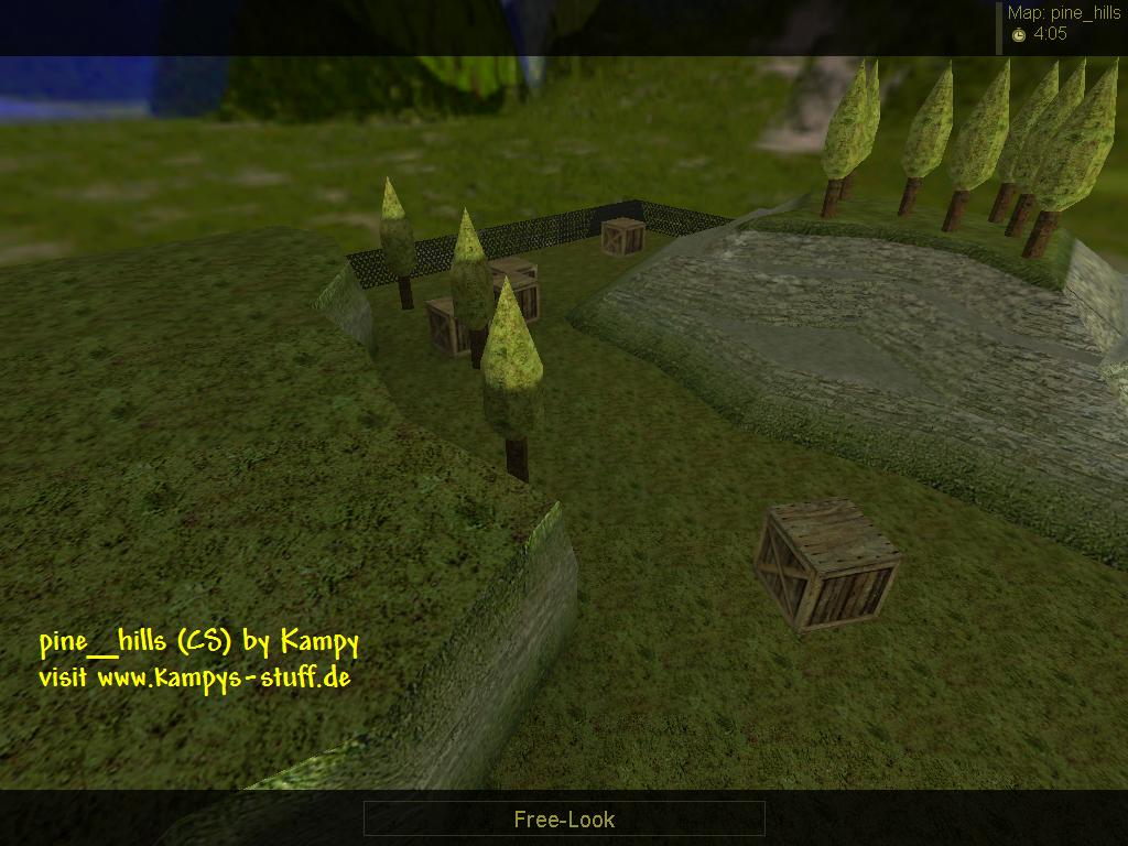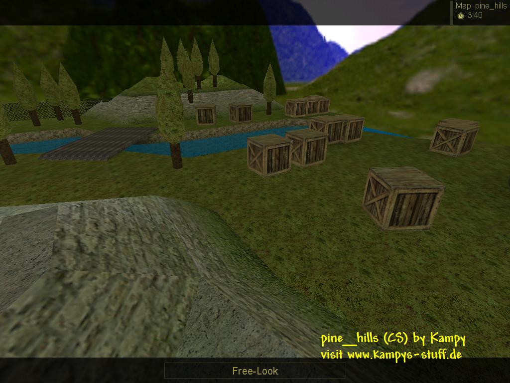 I made Pine_Hills for a modelmaker who made me the Deuce model (File Section) in return. He gave me a lot of room for my own style, he only said: there has to be a river, a bridge and some hills that are passable. So this is actually the map describtion already: there are some hills which where really hard work when I made them and a lot of trees which actually dont look like pines (but I liked the name) and some crates. There is no CS goal in this map - you have to kill the enemy. The map is good for sniping, but is not as most of these fun maps restricted to it. The usual gameplay of this map is that the terrorists camp and the CT storm the front coz they have got more cover. The terrorist can also storm before the CTs can see them which is also a good strategy. The battle is mostly faught at the river - there are several crates to take cover on both sides - or its a sniper duel, then it can be anywhere on the whole map. The gameplay is balanced due to many beta tests. This is a pretty small fun map with a nice atmosphere and a fair gameplay. The R_Speeds are a little too high though, I can only recommend this to owners of good computers. 6 Players is the absolute maximum of players this map can handle by the way - more would be a total mess. | |||||||||||||||||||||||||||||||||||||||||||||||||||||||||||||||||||||||||||||||||||||||||||||||||||||