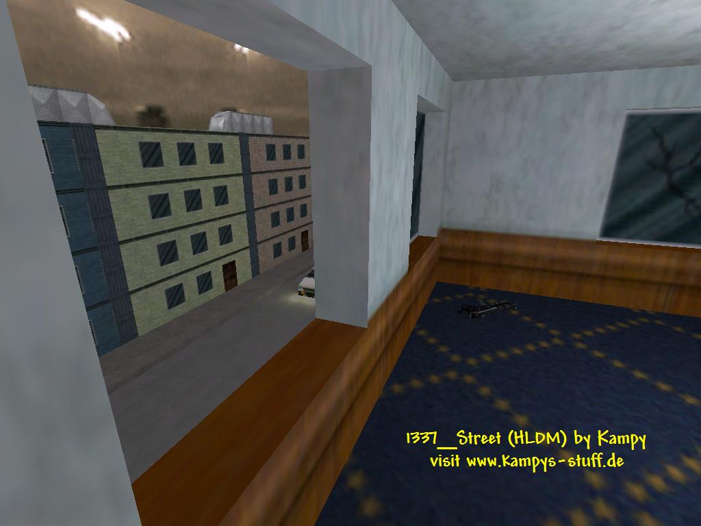 The name "1337_street" says two things about the map: it's a street, it's for 1337 players. Basically it's a street with seven houses four of which can be entered and two cars. The fun at this map is that you can jump around with the gauss and fight on the roof tops - the taucannon is placed in the middle of the street with four gaussclips. Another great fun point is the accessability of the houses. Once you touch a door a sequence starts and you receive the crossbow + ammo, a health kit, a battery and get teleported into the house. In these houses you can break the windows and snipe around. In this map there's a lot of action all the time, because actually the map is one big room - some said it was a killbox (grrr). The map doesnt look as bad as a killbox although it's a simple look with little details, but the r_speeds are very good for the structure of the map (max 450!). The weapons Glueon and Beegun are missing which is a pretty wise decision otherwise the map would lame a lot. The mostly used weapons are the taucannon, shotgun, RPG, colt and crossbow. When you leave a house through its door you will get the LongJump. This map is big fun for a game without lamers, it's for people who like flying around with the gauss and sniping through windows and have a lot of action all the time. want a Fun-Map? download now! | |||||||||||||||||||||||||||||||||||||||||||||||||||||||||||||||||||||||||||||||||||||||||||||||||||||