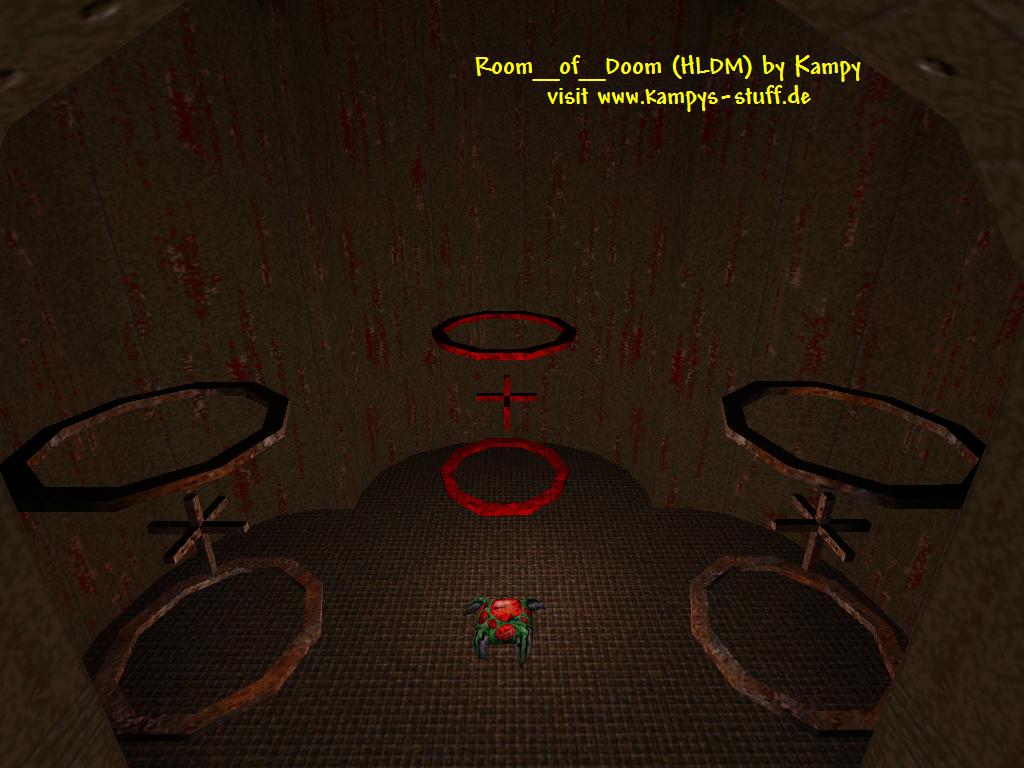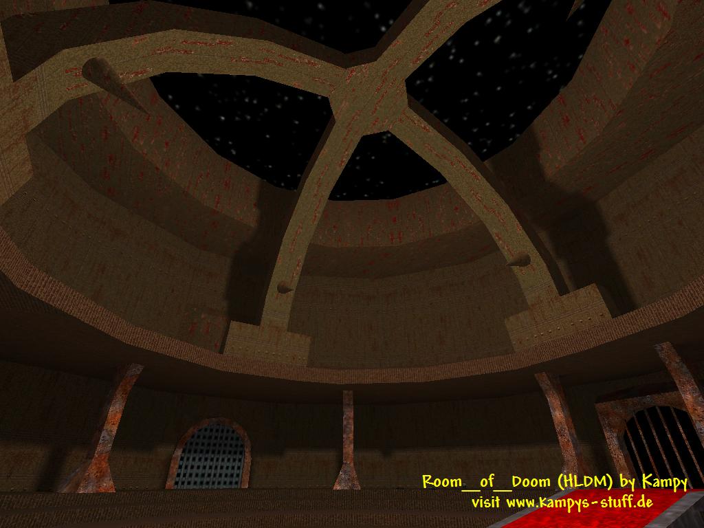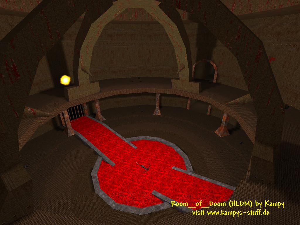 This is an arena type map with a quake or doom look. It had been a map of the "Operation A.M.O.K." mod which was canceled some time ago. I took the 85% ready map and completed it for Half-Life Deathmatch now. The architecture of the map is very complicated. The whole map is round and doesnt have a straight floor which was very hard to build with the HL engine. The R_speeds are a little high because of that ( 900). The gameplay is typical arena gameplay, you start grab a weapon and shoot into the middle of the arena. This is great fun and there's another cool feature of the map: at one side of the arena there's a wooden cross which you can turn around by using it. This causes a great explosion which kills everybody on the whole map. The only way to survive this explosion is to step into one of the teleporters and beam on the top of the arena. Then you have to crouch in the middle of it so you wont be caught by the explosion. Basically Room_of_Doom is one big cylinder room with 2 floors and a small position at the top of it. To get into the second floor you have to go through a small corridor where you can find some goodies. The teleporters are on the second floor. Both teleport you into the main teleporter room where you can choose if you want to go on the top of the arena or in the middle of it at the bottom. The itemplacement is like this: there are machine guns and shotguns next to each other placed at the starting points inside the arena hall. In the middle at the bottom there is the crossbow and in the corridor you find Colts, health, a battery and the longjump. Find ammunition in the teleporter room and the bazooka at the top of the arena. All weapons are regulary used in room_of_doom. Its a good choice to hide at the first floor with the crossbow, but if you do you are likely to die when someone turns the cross. All in all a cool arena map with lots of different weapons used and great for arena deathmatch or adrenaline gamers. | |||||||||||||||||||||||||||||||||||||||||||||||||||||||||||||||||||||||||||||||||||||||||||||||||||||