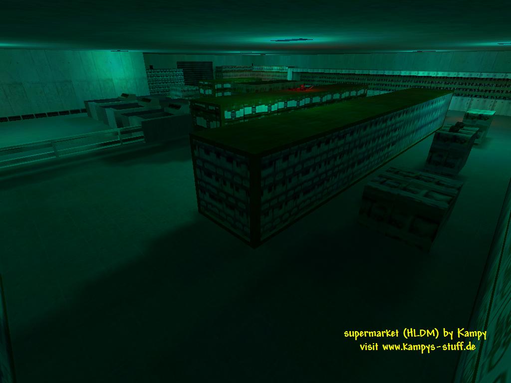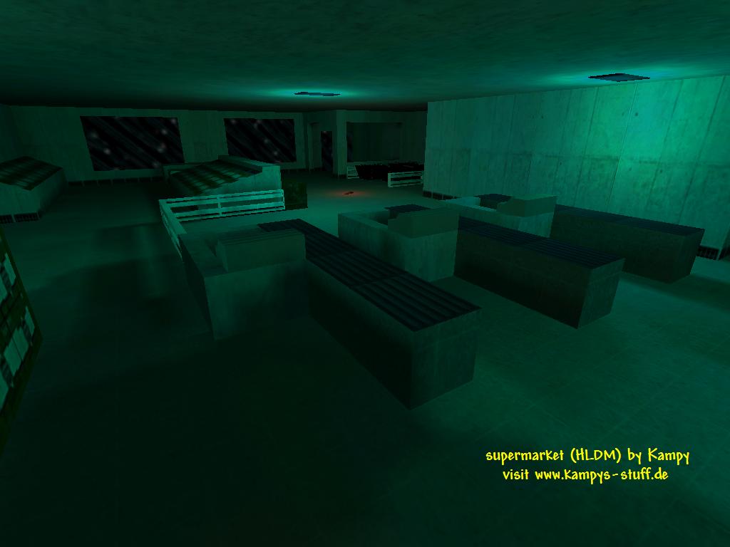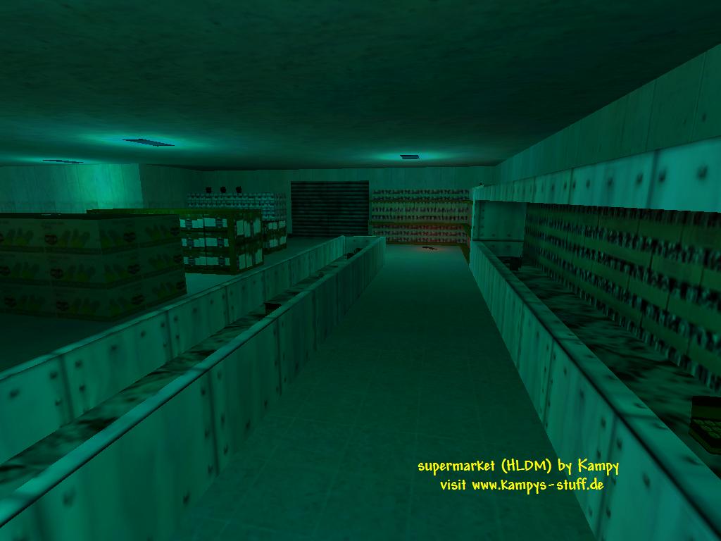 main points of the map: - supermarket theme - consists of one big room, sight is blocked through shelves - 2-4 players recommended - hectic gameplay, tiny map size - no heavy weapons, mostly colt, shotgun and machine gun used hints: - to get the LongJump look in the box near the cash register. - with the LongJump you can get a batteries on the highest shelve and you can jump on the normal shelves a lot easier. - to restock your ammo in a few seconds run through the freezer shelves - you can pull out one shopping trolley, well, it won't do anything though ;) - with 3 or 4 players you can try a nice spam trick - there are 3 cash registers and 3 boxes next to them. in one is the LJ, in one is health and in the last one there are handgrenades - duck and through them into the open area when you hear your enemy. It's quite effective when youre not attacked at the moment. | |||||||||||||||||||||||||||||||||||||||||||||||||||||||||||||||||||||||||||||||||||||||||||||||||||||